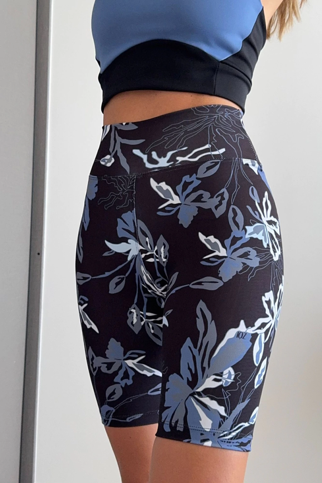Este modelo tiene una estampa floral en negro, blanco, gris y azul celeste grisaceo